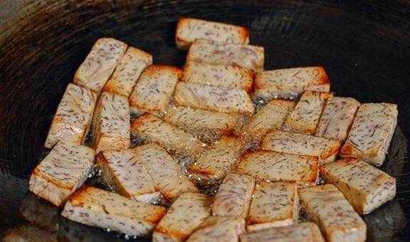 3.锅中留适量的食用油,再将切好的芋头倒入锅中,继续用小火慢煎,同样将鱼头两面煎至金黄(芋头很容易粘锅,煎制过程要经常翻动),再加入适量的豆瓣酱、蚝油和老抽翻炒上色;
