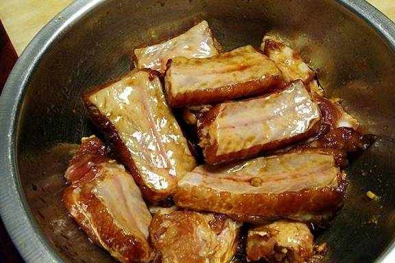 2.大火将锅烧热,锅中加入适量的食用油,待到油温升至四层左右,将腌制好的排骨倒入锅中,转小火慢煎,待到排骨表面呈现金黄后,翻面继续煎,最后即可关火出锅备用;