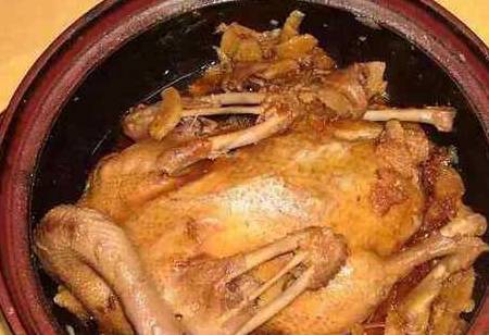 4、中间要适时给鸭子翻几次面,以便鸭皮和鸭肉上色均匀。煮至鸭爪关节出绽开,取出瓦甄放在煤气上,开大火,将汁水不断往鸭身上舀,至汤汁浓稠,起锅前加入1大匙香油即可。