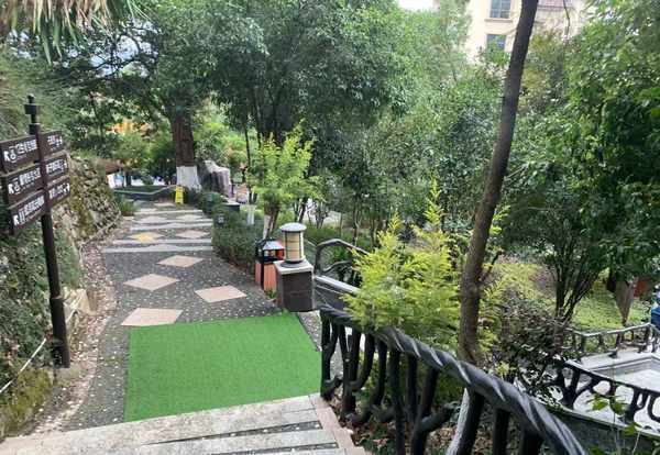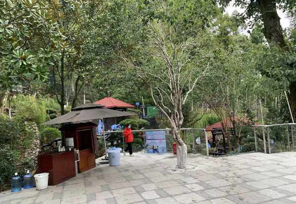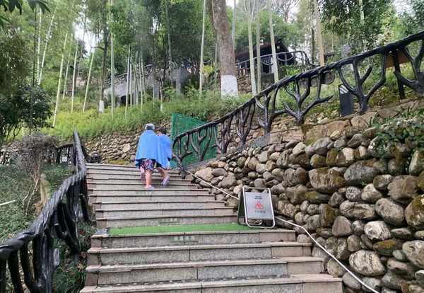 山道转折处,有显眼的指示路牌。若去无边泳池,还得上靠山而建的观光电梯,当然走山道阶梯也上得去,只是费力些。