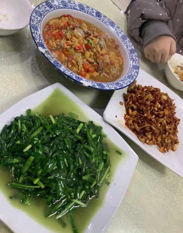 鱼杂和肥肠非常辣,但很可口。儿子后来说这两个菜是他吃过的最好吃的两道菜。