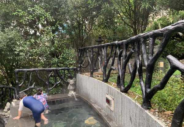不过还是要往室外跑,室外有很多汤池,再说也得见识见识它宣传的卖点---无边泳池。明月山温泉的室外汤池是顺着山势而建,从山顶的无边泳池开始,一路顺山而下,在不同高处,沿山道布置了很多的汤池,因此每个汤池,既有一定遮蔽,也保留了风景。
