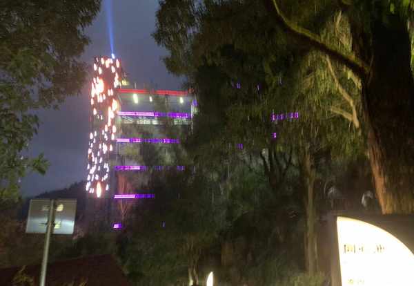 先去观光电梯上无边泳池,然后再准备从山顶往下泡汤池。在温泉外面看观光电梯,我还以为是蹦极的设备呢。