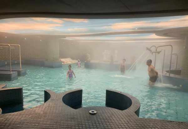 整个下午,我们就在这个池子没挪窝,泡累了就在池边坐着泡脚。一直到了晚上,才应孩子要求,去室内游乐池又玩了一会。