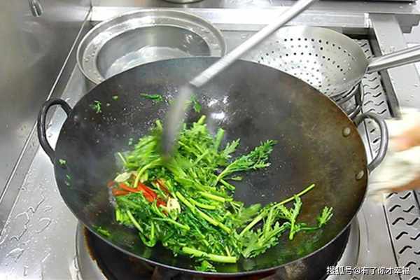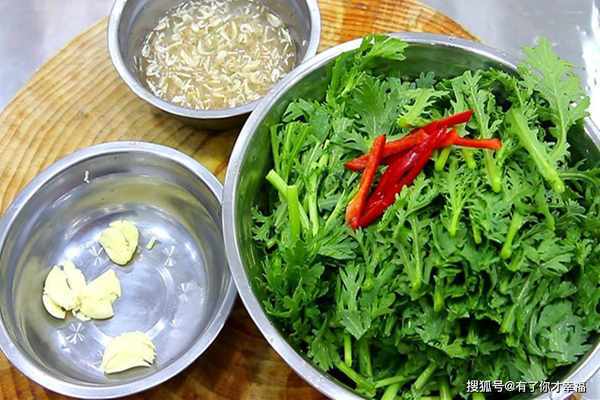 2.锅内烧油,油温升至四成热时倒入大蒜,炒出蒜香味之后倒入茼蒿和红椒,迅速翻炒至断生。