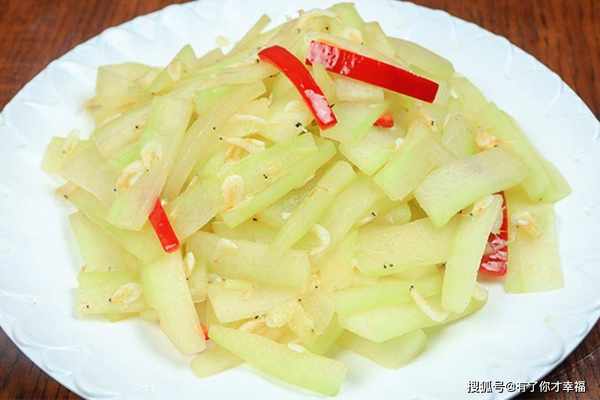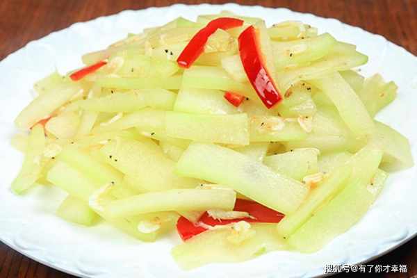3.冬瓜断生以后加入一勺食盐,一勺鸡粉,少许白糖提鲜,把虾米控干水分也倒入锅中,再倒入红椒丝,翻炒几下即可出锅。