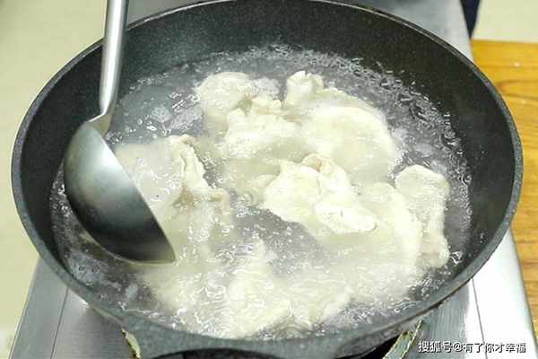 3.烧半锅开水,把肉片依次放进去,肉片非常薄,大约煮30秒钟,肉片浮起来就熟了。