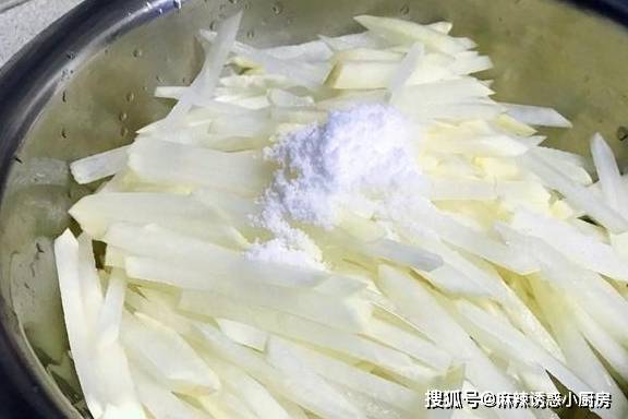 3、把切好的萝卜条放在一个大点的盆里,加上一勺盐,用筷子搅拌均匀,先腌制5分钟。
