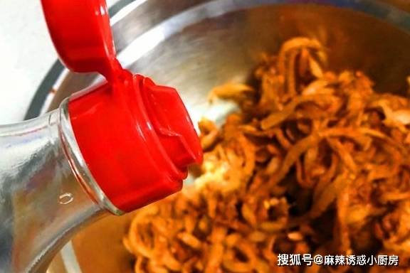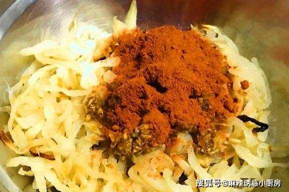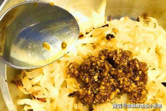 8、等萝卜凉透之后加入蒜蓉酱、辣椒面和味精,搅拌均匀。