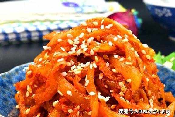 【所需食材】:白萝卜1根、辣椒面2勺、盐1勺、蒜蓉酱2勺、味精少许、麻油少许、白熟芝麻适量。