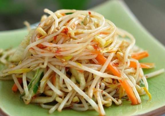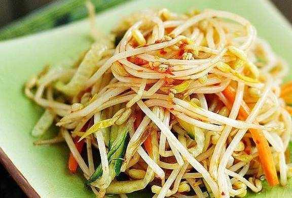 绿豆经水浸罨后,发出的嫩芽,性味甘凉,能清热解毒,利尿除湿,其作用较绿豆弱。可用于饮酒过度,湿热郁滞,食少体倦,小便不利等。煎汤、炒食均可