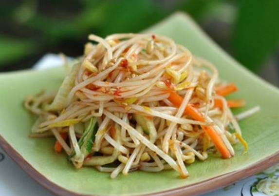 凉拌绿豆芽材料:绿豆芽80克,青瓜半截,胡萝卜适量,火腿两片,香菜两根,大蒜2瓣,油辣子1勺,香油1勺,香醋1勺,味极鲜1勺,凉拌汁1勺,白糖少许