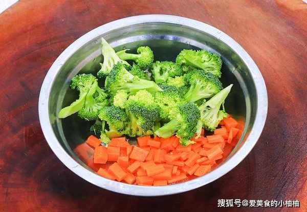 小葱头几根切成段,胡萝卜半根切成丁,西兰花把根茎去除,切成小块 放入清水中洗干净,再准备几粒干香菇,用热水泡发。