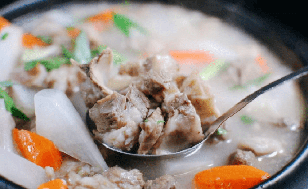 10 . 将羊排汤与锅一起端上桌,分盛到每个人的碗中,可以根据自己的口味添加适量的葱花、香菜、白胡椒粉、辣椒油、食盐和味精等调料。