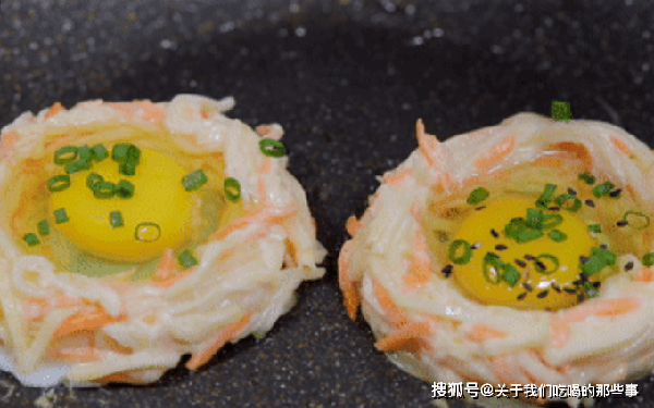 2、平底锅倒入少量油,烧热后舀一勺蔬菜丝放入锅中,用筷子整理成鸟巢状,中间打入一个鸡蛋,撒上葱花、黑芝麻,小火煎至定型,用铲子翻个面,继续煎一会儿,等到两面都焦黄后即可出锅,早餐饼就做好了,吃起来外焦里嫩,鲜香美味。