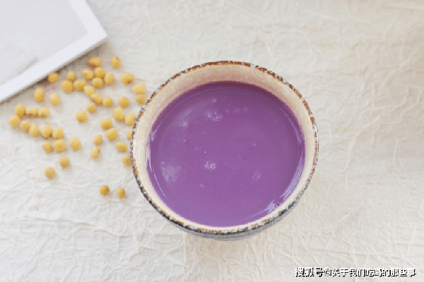 2、把黄豆、山药、紫薯放进破壁机,加入适量清水,根据个人口味加入适量冰糖,选择豆浆模式,等待时间结束,好喝的粗粮豆浆就打好了,细腻香甜,还能补脾健胃。