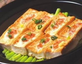 4、热锅冷油,将豆腐带馅的面朝下先煎至金黄,再翻面,两面都煎至金黄