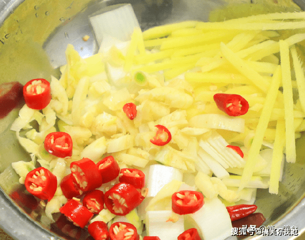 葱白破开切成葱花、生姜切成丝、大蒜拍扁切成末、小米椒切成圈,放在一起备用。