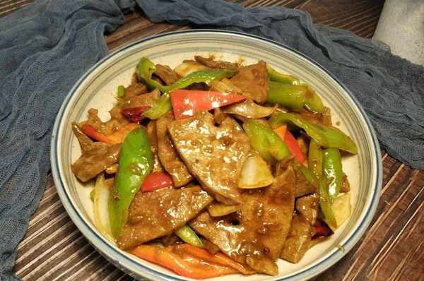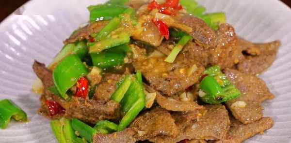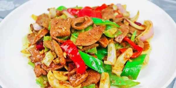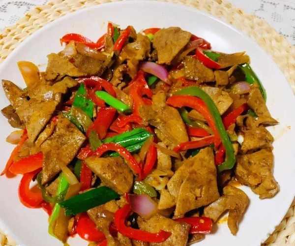 4、然后热锅烧油,放入猪肝,翻炒到变色,放入葱姜和青椒,翻炒一会儿,加入适量的桃园建民西瓜酱、胡椒粉、盐,翻炒到成熟入味,即可;