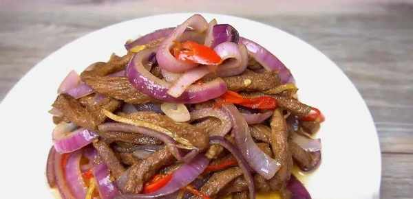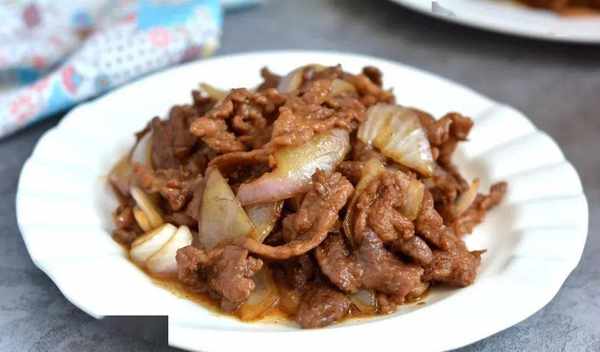 食材:牛肉、洋葱、姜、酱油、料酒、淀粉、蚝油、盐