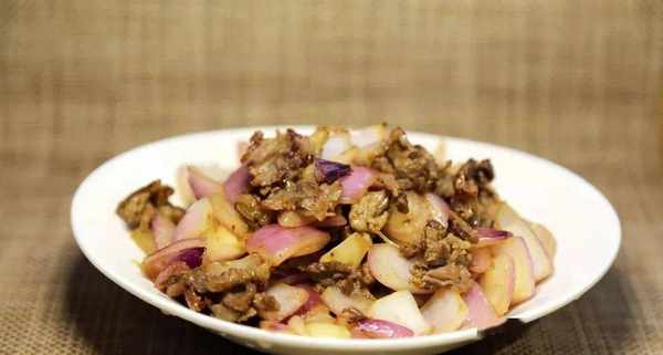 3、然后热锅烧油,放入洋葱碎,翻炒一会儿,放入牛肉,煸炒一会儿后,加入一点蚝油和盐,继续翻炒到食材成熟入味;即可;