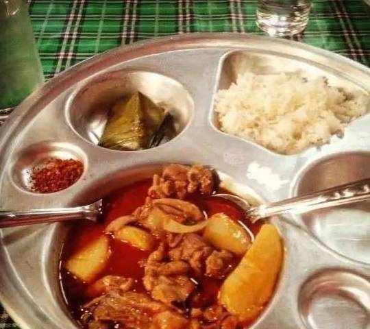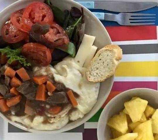 美国的法语学校的午餐。有牛肉的布吉尼翁和新鲜的菠萝。美国一直以来都是一个世界强国,而且是各个方面都很好的,他们一直以来对学生都是很好的,所以说午餐自然是不会差的了啊!
