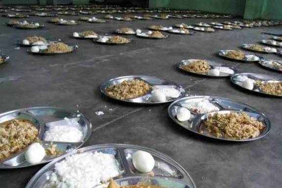 印度学生的午餐。碗饭。水鹿和甜点rassogula。不知道为什么看着有点凄惨的感觉呢?