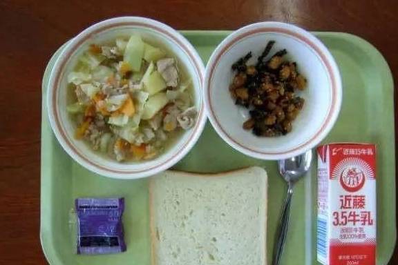 日本学生的午餐。有牛奶,汤、面包和泡菜。看着他们的汤我就真的一点胃口都没有了,真是不知道他们到底是怎么想的呢?