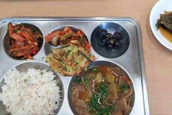 韩国学生的午餐。芝麻叶泡菜,泡菜,豆瓣酱、炖菜饭和葡萄。我最不能理解的就是韩国的午餐了,其实这种午餐如果给我我连看都不想看的,不知道他们是怎么吃得呢?