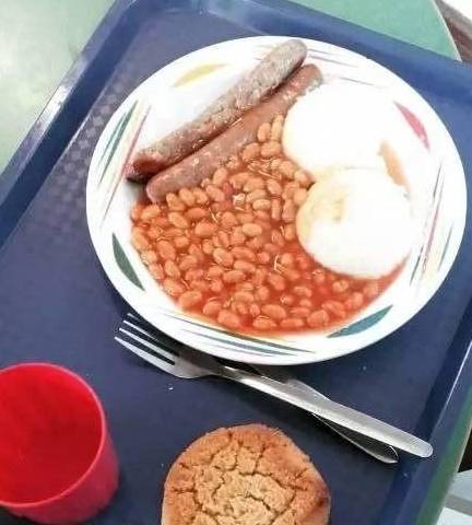 英国学生的午餐。有香肠、土豆泥和烤豆。果然不同国家的文化就是不同啊!