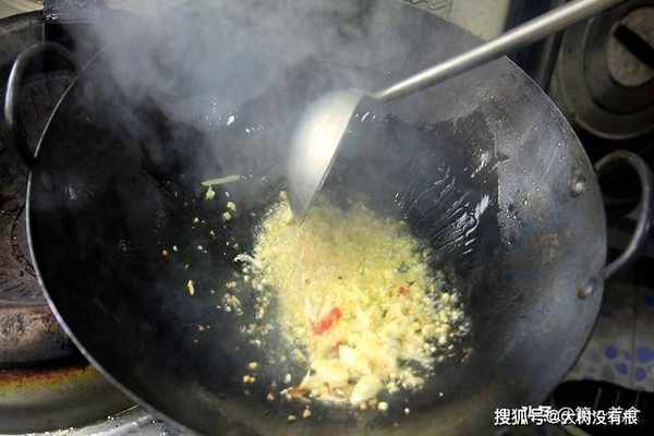 锅内烧油,油热以后倒入葱、姜、蒜末和小米椒,快速翻炒出香味。