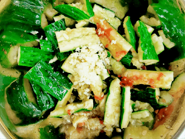 3、全部拍好之后,倒进碗中,接着开始调味,加入适量的白糖、食盐、鸡精,再来2勺醋,1勺剁椒,1勺芝麻香油,1勺蒜末,搅拌均匀,即可开吃。