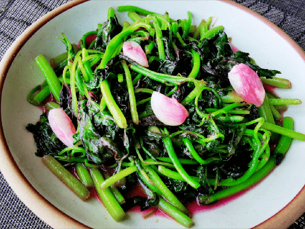 3、整个过程,也就几分钟左右,炒时间长了,就不好吃了,用红苋菜可以直接拌饭吃,红彤彤的饭粒,看着就很有食欲,可以拿来哄孩子,脂肪低热量低,也适合大人。