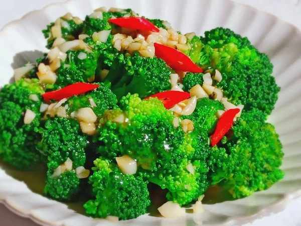 3、依次淋入到西兰花上即可,重口味的小伙伴,还可以放几个小米椒,点缀一下。