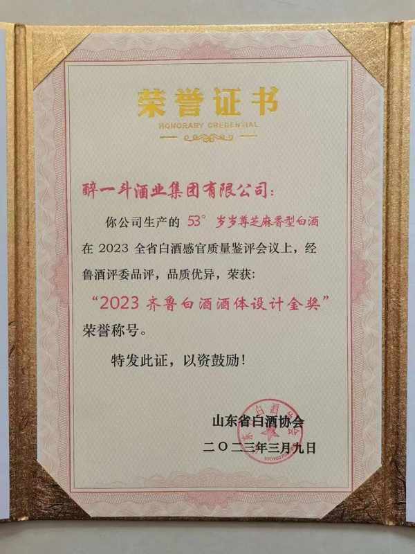 醉一斗岁岁尊芝麻香型白酒获2023齐鲁酒体设计金奖,可喜可贺!