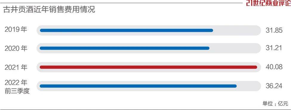 2019-2021年,销售费用分别为31.85亿、31.21亿和40.08亿元,销售费率在30%上下,高于茅台、五粮液、汾酒等领先品牌。
