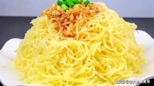 把调好的料汁倒在土豆丝上,加少许葱花点缀即可上桌食用。
