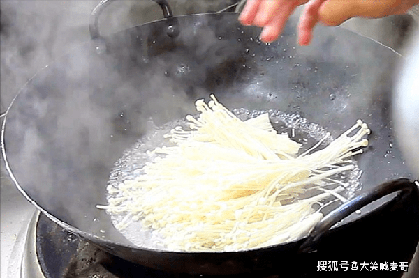 锅内烧水,水烧开后,放入金针菇,撇去锅中的浮末,焯水20秒以后,捞出金针菇,用凉水快速冲洗金针菇。