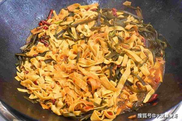 再加少许的老抽上底色,倒入炸好的豆腐皮,把海带结再用水冲洗一下,也倒入锅内,加入食盐,鸡粉,胡椒粉,白糖,用勺子搅拌汤汁,化开调料,让汤汁更入味,盖上锅盖,开中火,焖煮1分钟,一分钟后,汤汁浓郁粘稠,然后起锅装盘。
