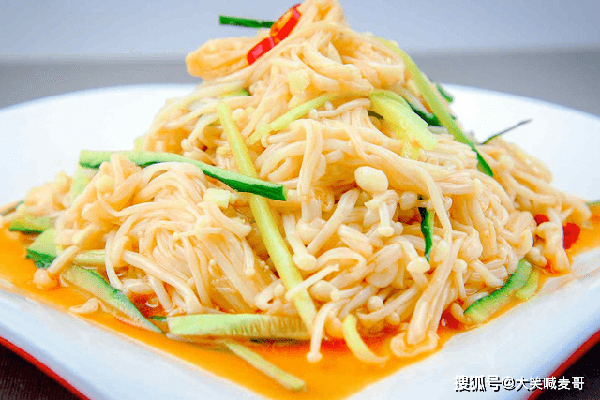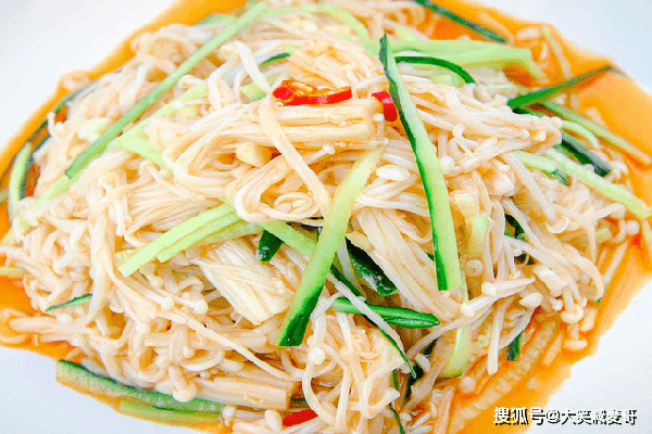 把金针菇沥干水分,倒在盆中,加入蒜末,黄瓜丝,小米椒,搅拌均匀以后,加入一勺食盐,一勺鸡粉,一勺白糖,放入辣鲜露、陈醋、芝麻油和辣椒油,用筷子搅拌均匀,即可装盘。