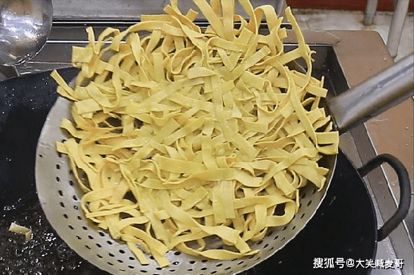 锅内烧油,油烧到冒青烟(7成热),倒入切好的豆腐皮,炸至变硬,捞出控油。