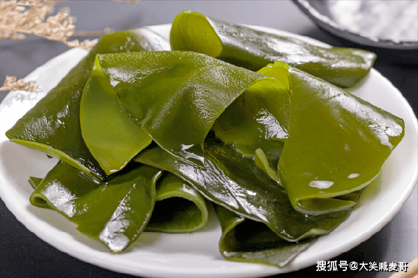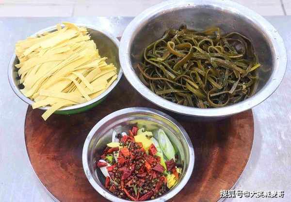 准备海带结一盘,放入盘中备用,豆腐皮两张切成宽条,大葱白一段切成马蹄片,生姜切成片,干红椒一小把,大茴两粒,花椒一小撮,香叶几片,桂皮一片,放在盘中备用。