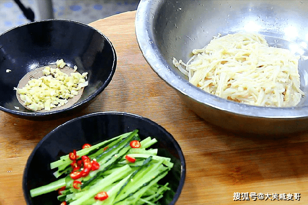 准备金针菇200克,去除根部,用手撕开,洗净放在盆中备用,黄瓜半根,切成四厘米左右的段,先切成薄片,再切成细丝,放在碗中小米椒两个,切成辣椒圈,与黄瓜丝放在一起,大蒜拍扁,切成碎末,放在碗里。