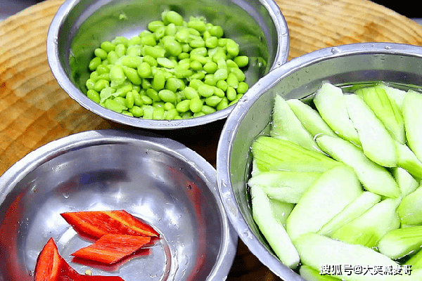 毛豆100克,清洗干净。红椒半个,切成菱形片。
