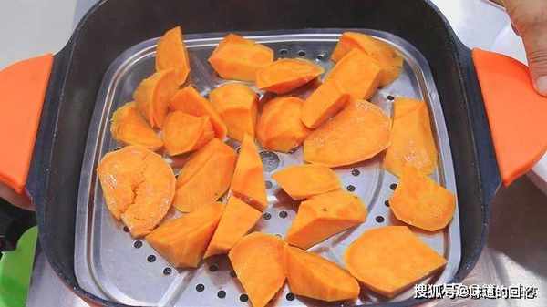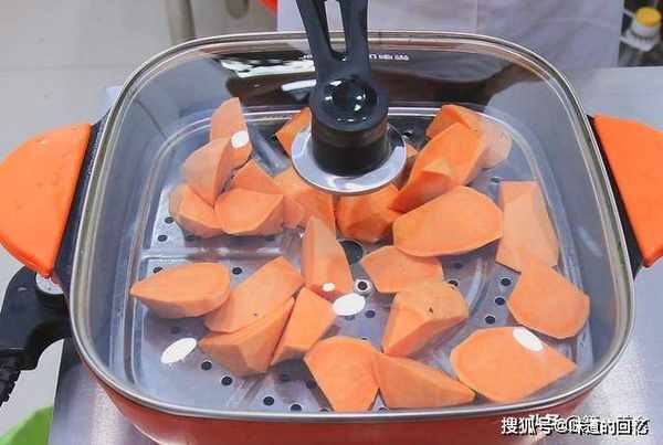 十分钟后,红薯已经蒸好了,把蒸好的红薯从锅内取出,装入盆中。