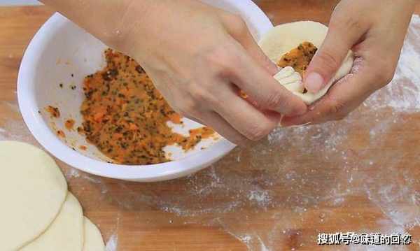 一个一个擀好以后,开始包馅,像包包子一样把红薯泥包好,再用手按成饼。