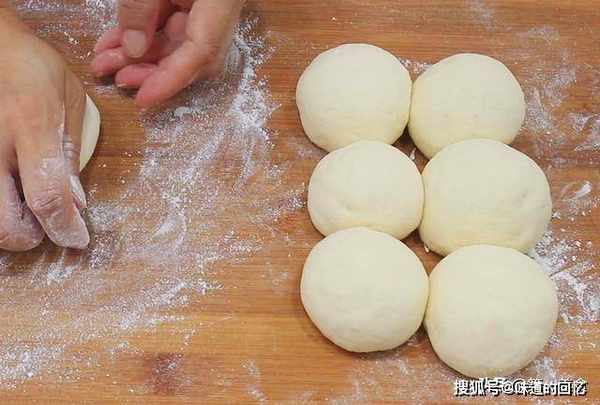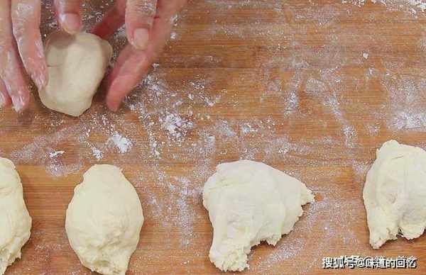 再把面团揉成长条状,用手揪成一个个大小均匀的小剂子,然后撒上少许面粉, 把小剂子揉成一个圆,团得圆一些。
