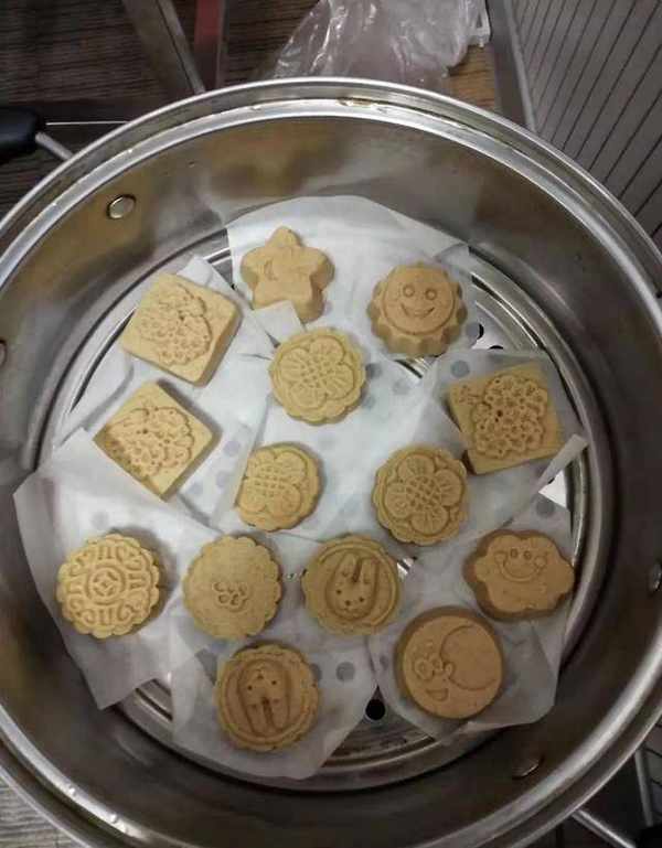 之后用温水把这些粉揉成一个面团,糖根据自己情况,不能吃甜就不加。之后就可以用做月饼的模具,压出花型,上锅隔水蒸熟,蒸的时间基本在半小时以上,根据做出的糕点大小决定。