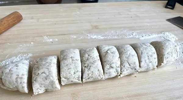 准备鸡内金10克,茯苓5克,山药10克,小麦粉150克,建议把鸡内金炒熟后磨粉,茯苓和山药也磨成粉,之后加温水,和少许芝麻与小麦粉一起和成面团,静置半小时。