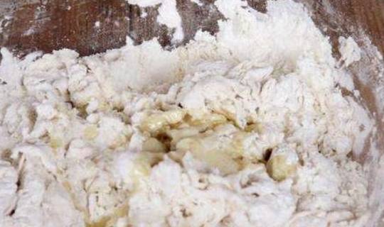 1、准备一个面盆,放入适量面粉,泡打粉,盐,准备适量清水,少量多次的倒入面盆中,一边倒入水,一边搅拌,直至成为絮状,然后用手揉面,揉成光滑的面团。